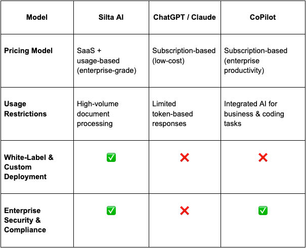 Artificial Intelligence is rapidly transforming how professionals work, but not all AI solutions are built the same. While ChatGPT, Claude, and CoPilot are impressive for general-purpose tasks, they serve very different functions than the use case offered by Silta Finance.