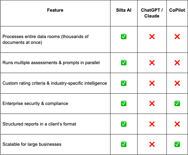 Unlike consumer AI tools, Silta AI processes thousands of documents at once, applies custom rating criteria, and delivers structured reports—far beyond what general-purpose AI tools can do.